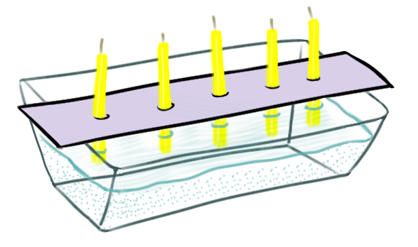 - Fill loaf pan or any container part way and set brace over it — see diagram. Candles should be immersed half inch or more in water.