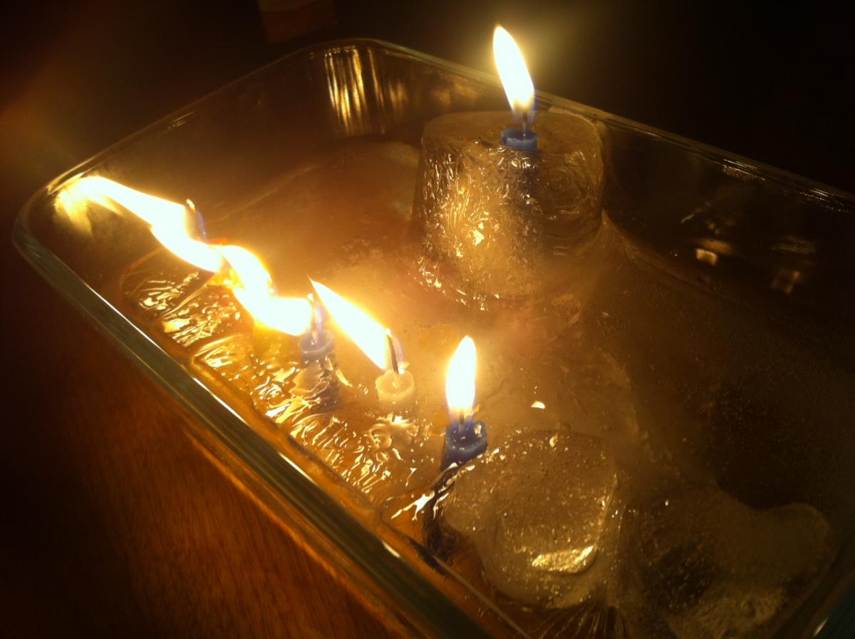 You'll notice while the menorah is burning that the melted ice warms up and creates its own channels (see pic above), sometimes making holes through the ice. Among other things, that's a great moment to talk about melting glaciers. Let us know what you do and how it goes!