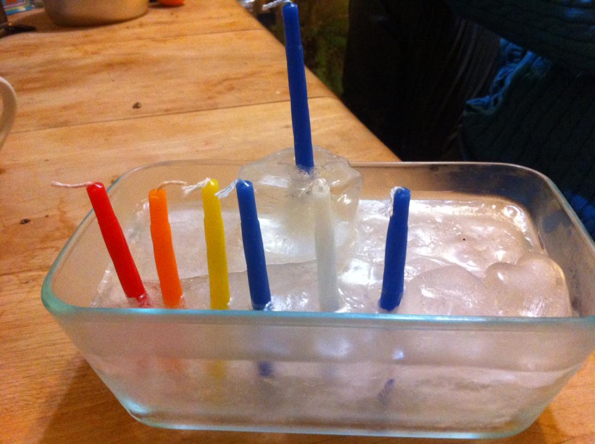 - Remove ice with shamash, put it on top of ice in loaf pan. add another half inch or more of water to freeze the shamash to the rest of the menorah.