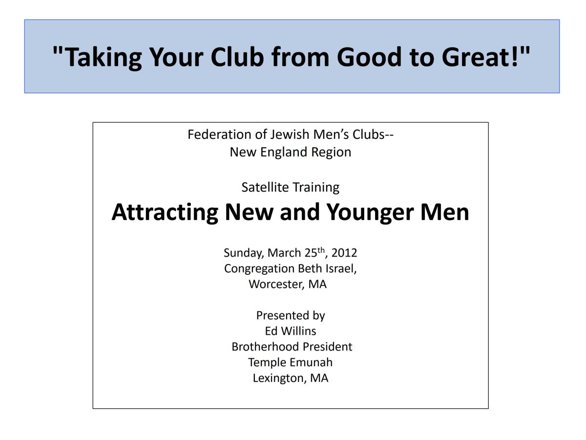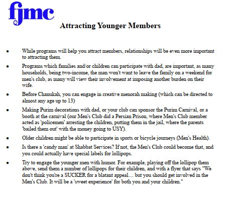 We need our older and younger members in our clubs. They bring differing perspectives to involving Jewish men in Jewish life. The diversity of ages contributes to innovation in developing programming that better connects people of all ages in the community. Community entails forming meaningful, long-lasting relationships based on comraderie, common threads and core values. Though we pride ourselves in attracting members of all ages, many clubs feel they need particular help with attracting younger members. And so, we are in process of developing this page to highlight ways that your club can attract younger members. Some ideas follow: