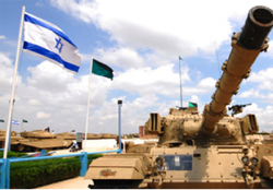 Merkava tank decorated with flags, in an open military exhibition for Independence Day |