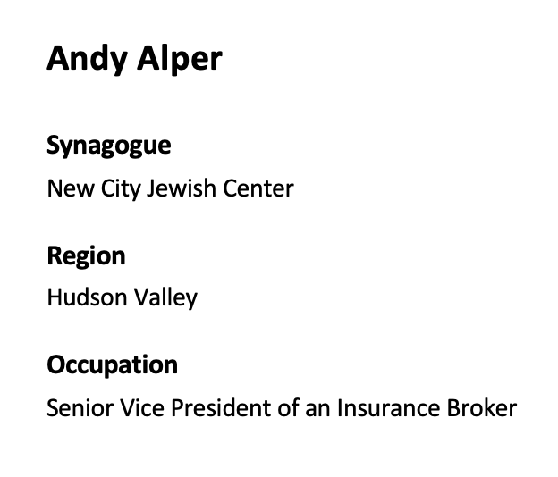 Our October 2021 Honoree: FJMC's Volunteer of the Month is Andy Alper from the Hudson Valley Region. One rarely meets a selfless person devoted to his family, work, synagogue, community, and FJMC as Andy. He is a former President of the New City Jewish Center Men's Club and Past President of the Hudson Valley Region. Every year, he undertakes the essential and time-consuming job of designing and editing the Tribute Journal for the Hudson Valley Regional Men of the Year event. Andy coordinates the region's Shabbat service at the U.S. Military Academy at West Point. He is the Recording Secretary of his Synagogue's Executive Board. When Andy is not volunteering for a good cause, he spends his workweek as Senior Vice-President at Marsh USA, the world's leading insurance broker and risk advisor.